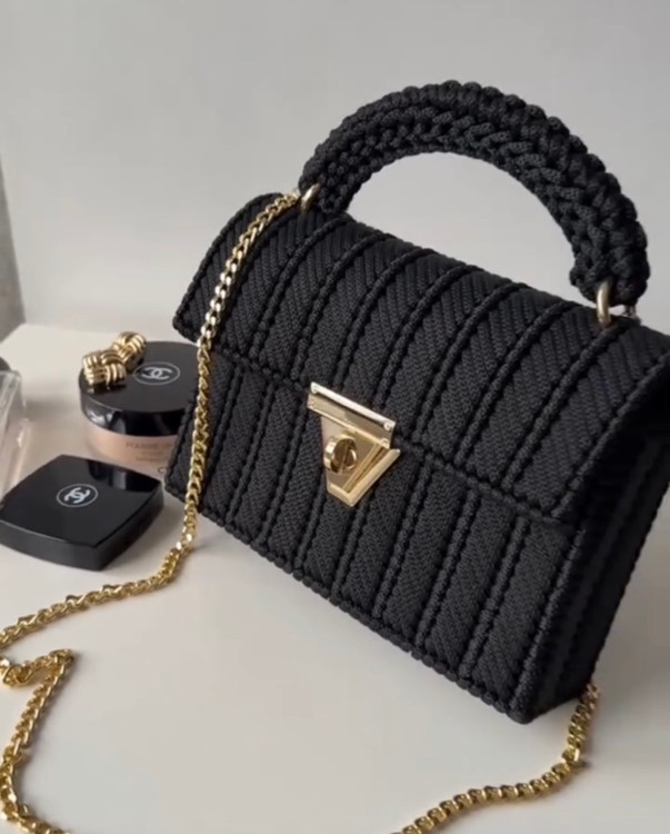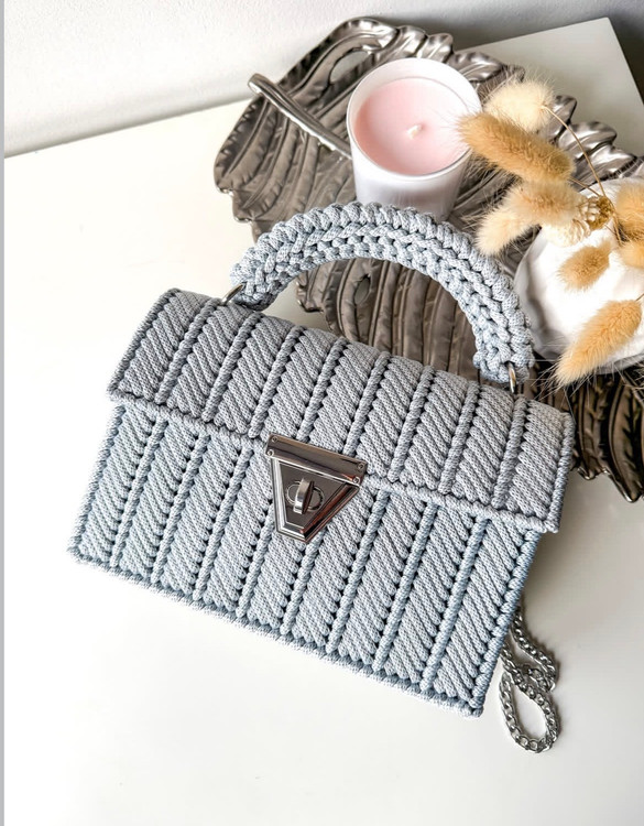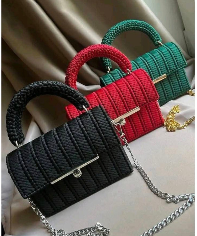 این کیف کاملا دستبافت هست وروی توریهای مخصوص کیفبافی احرا میشه با نخ های مکرومه سه سوزنه که میشه تو هر رنگ دلخواه اجرا کرد واندازه هم قابل تغییر است